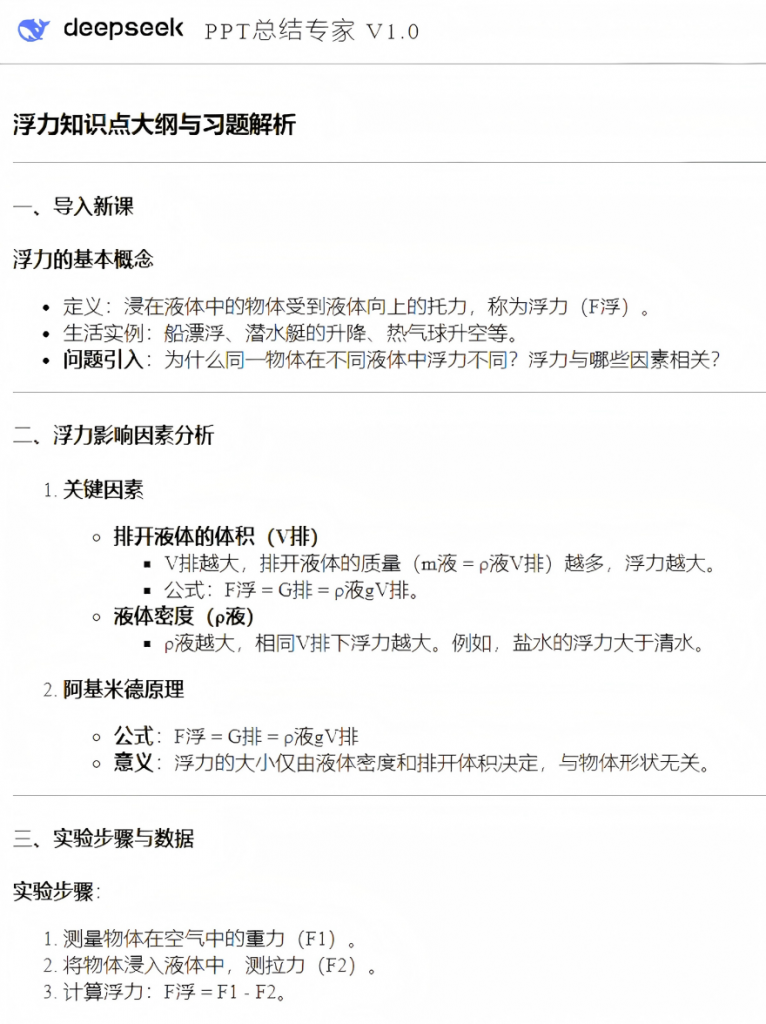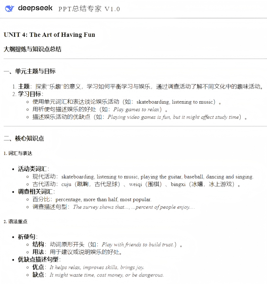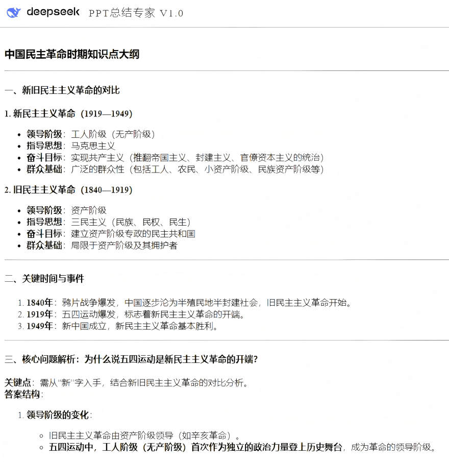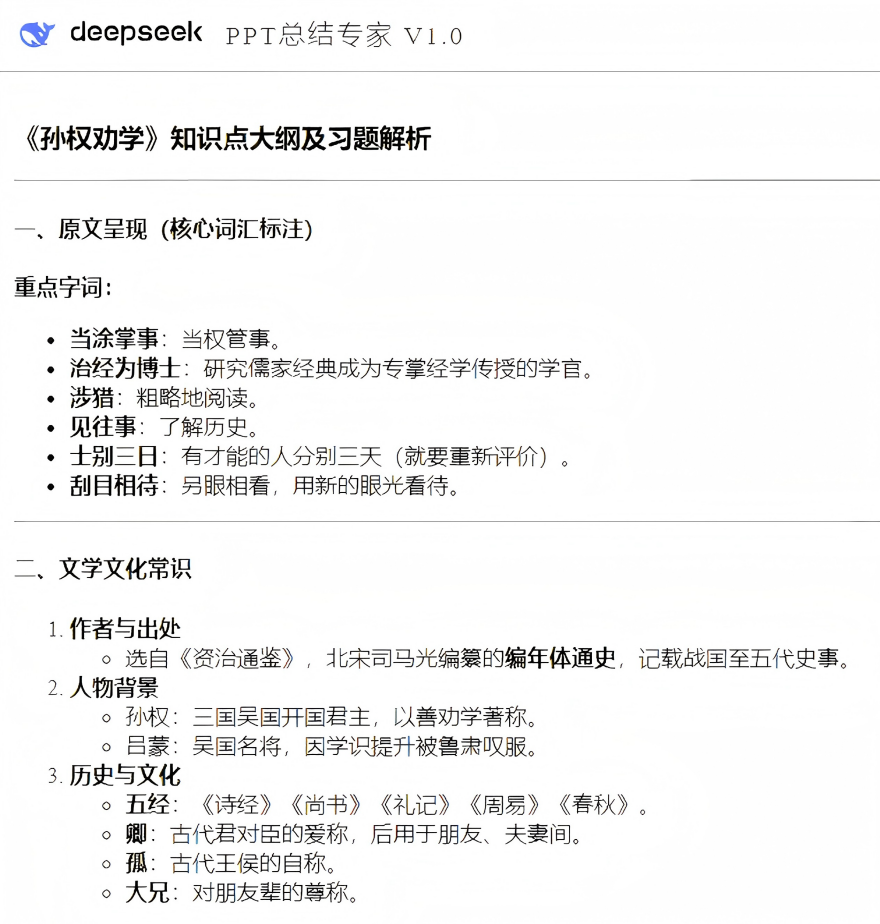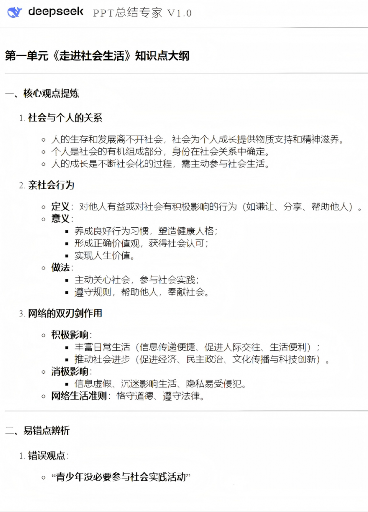 DeepSeek对PPT课件的深度解析,以I技术为桥梁,实现知识的结构化与学习路径的精准化。通过系统化的知识梳理、易错点警示与解题策略指导,学生在复习中不仅能温故而知新,更能在深度思考中实现认知跃迁。